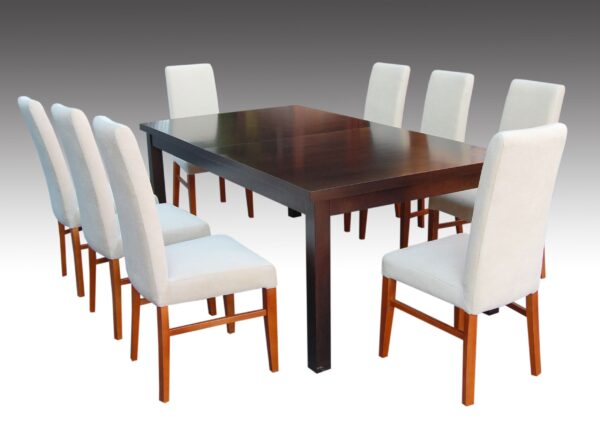 Zestaw Stołowe - nowoczesne, masywny, rozkładany stół na prowadnicach symetrycznych- podstawa lite drewno bukowe, blat wykonany z okleiny naturalnej. W skład zestawu wchodzą eleganckie krzesła (do wyboru z pośród kilkunastu modeli) - możliwość wykonania dowolnego wymiaru na buku i dębie. Szeroka paleta wybawień. Polecamy do przestronnych salonów i aneksów kuchennych.